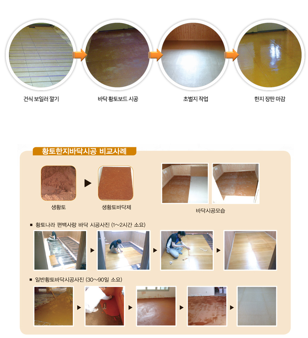 콘크리트나, 난방 필름 위에 직접 시공 생황토 보드 접착 + 초배지 접착 + 장판 한지 접착 + 셀락 뿌림생황토 보드 접착 + 파초 한지 접착 + 셀락 뿌림 ※ 넓은 공간 시공시 시간이 많이 필요합니다.